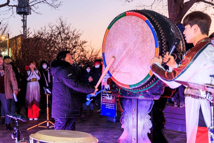 | ▲ 2023년 해맞이 행사가 열린 하늘공원 정상에서 박강수 구청장이 새해 첫 북을 치고 있다. (사진=마포구청 제공) |