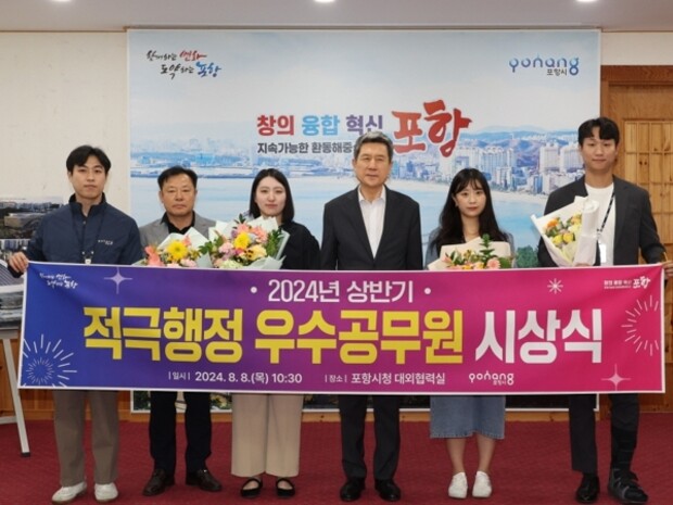 [포항=박병상 기자] 경북 포항시는 적극적인 업무 추진으로 시민체감형 행정을 펼친 ‘2024 상반기 적극행정 우수공무원’으로 팀 2팀, 개인 1명 등 총 6명을 선발해 8일 시상식을 개최했다.