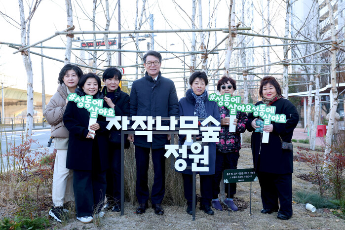 | ▲ 지난 6일, 정원오 구청장(왼쪽 네 번째)과 주민들이 숲정원 조성을 축하하며 단체 기념 촬영하고 있다. (사진=성동구청 제공) |