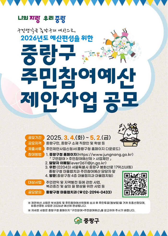 [시민일보 = 여영준 기자] 중랑구(구청장 류경기)는 2026년도 예산에 반영할 주민참여예산 사업을 발굴하기 위해 4일부터 오는 5월2일까지 제안사업을 공모한다.