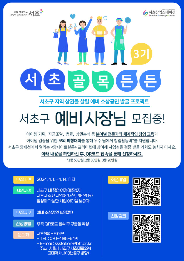 [시민일보 = 이대우 기자] 서울 서초구(구청장 전성수)가 창업 준비 중인 예비 사장님들을 발굴· 육성하는 ‘서초골목든든’ 3기 프로그램 참여자를 모집하여 서초 골목상권을 활기차게 만든다.