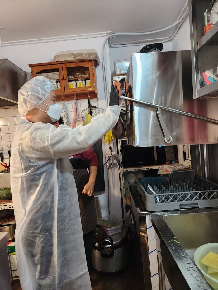 | ▲ 주방 위생상태 확인하는 구청 직원 (사진=동대문구청 제공) |