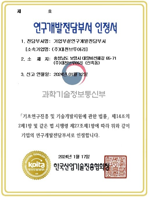 대천브루어리 관계자는 “이번 인증을 통해 연구개발 역량을 강화할 수 있는 중요한 기회를 얻었다”며, “앞으로도 지속적인 연구개발을 통해 혁신적인 제품을 선보이고, 기술 경쟁력을 더욱 높이겠다”고 말했다.