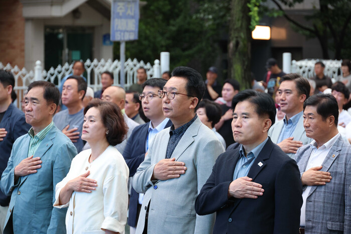 | ▲ 사진=제20회 한미친선 한마음축제에서 국민의례하는 내외빈. |