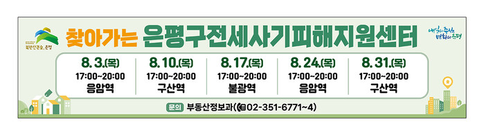 31일 구에 따르면 ‘찾아가는 전세피해지원센터’는 신축빌라 일대와 구청 방문이 힘든 직장인 피해자를 위해 응암역, 불광역, 구산역 일대에서 운영되는 것으로, 전세사기 피해자의 가정 재무상담, 채무조정 신청, 복지와 연계한 맞춤형 서비스를 제공한다.