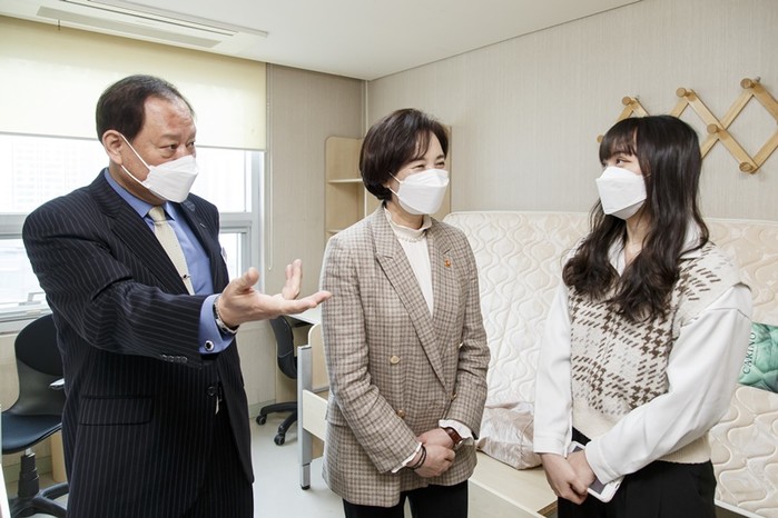 마포구는 유은혜 교육부총리와 14일 지역내 서강대학교를 방문해 1학기 대면수업 준비와 코로나19 방역상황을 점검하고, 지방자치단체와 대학 간 방역체제 상호협력과 코로나19 감염 확산 방지 방안에 대해 논의했다. 사진은 유동균 구청장(왼쪽)과 유 총리가 ‘곤자가 국제학사’에서 중국인 유학생과 대화를 하고 있는 모습. (사진제공=마포구청)