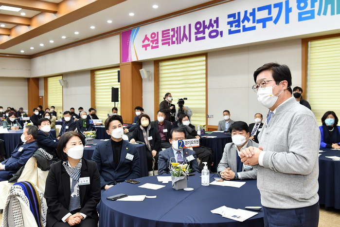염태영 경기 수원시장은 4일 민선 5·6·7기 주요 사업 공유, 시민과의 대화로 진행되는 ‘시민과 함께하는 2022년 열린대화(장안구·권선구)’에 참여했다. 사진은 이날 행사에서 염 시장(오른쪽)이 권선구민들과 대화를 하고 있는 모습. (사진제공=수원시청)