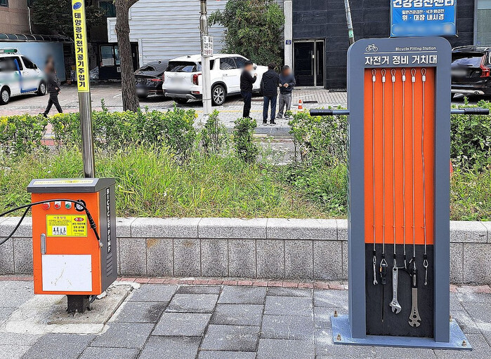 ‘자전거 정비 거치대’는 자전거 이용자가 많은 응암역 3번출구 불광천 인근 응암역 교통섬 내에 설치됐다. 경정비 수리 공구 6종(소켓렌치, 페달렌치, 몽키스패너, 10mm스패너, 8mm스패너, 드라이버)과 자전거 거치대로 구성됐다.