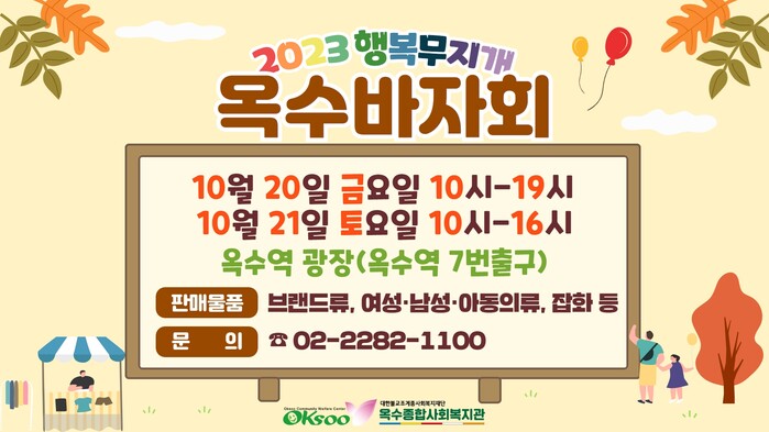 [시민일보 = 홍덕표 기자] 서울 성동구(구청장 정원오) 옥수종합사회복지관이 오는 20일 오전 10시부터 21일 오후 4시까지 옥수역 광장(옥수역 7번 출구)에서 ‘2023년 행복무지개 옥수바자회’를 개최한다.