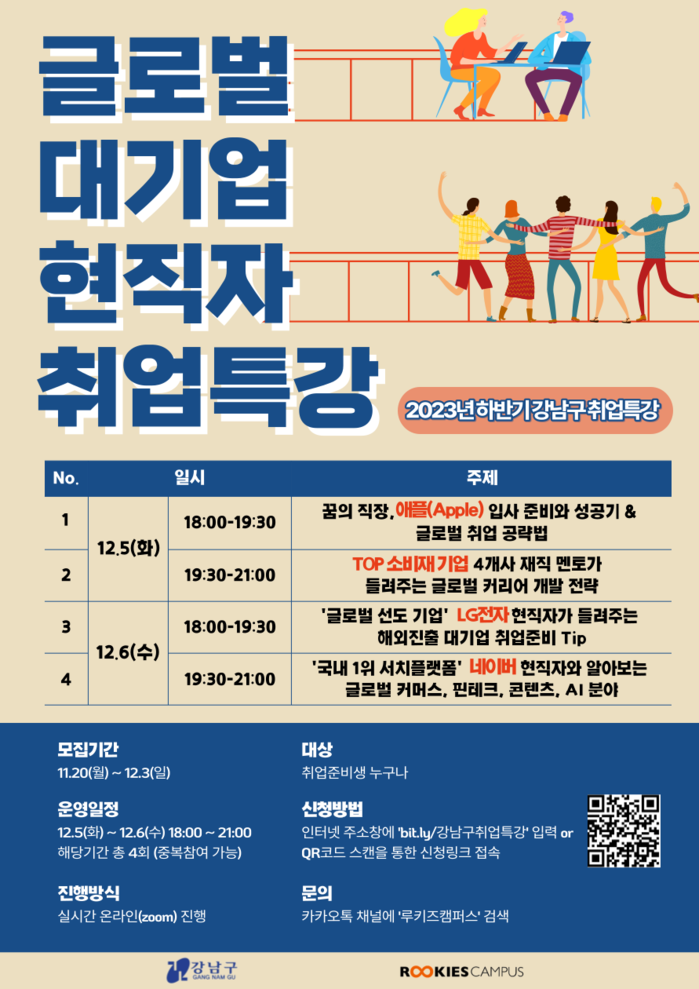 참가신청은 12월3일까지 ‘bit.ly/강남구취업특강’ 또는 포스터의 QR코드 스캔을 통해 신청할 수 있으며, 총 4회의 수업은 중복 참여가 가능하다. 자세한 사항은 구청 일자리정책과 혹은 카카오톡 채널 ‘루키즈캠퍼스’에서 문의하면 된다.