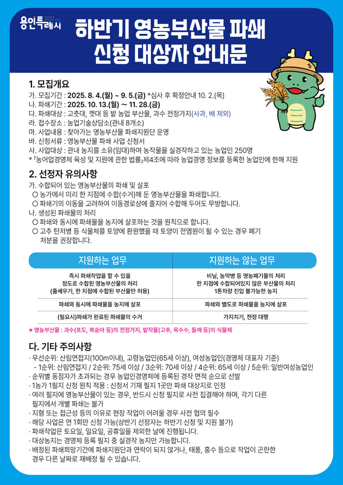 [용인=오왕석 기자] 용인특례시(시장 이상일)는 용인시농업기술센터에서 미세먼지 저감, 산불 예방, 병해충 발생 최소화를 위해 ‘2025년 하반기 영농부산물 안전처리 지원 사업’ 신청자를 모집한다고 29일 밝혔다.