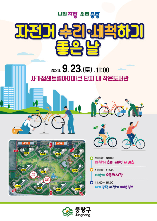 [시민일보 = 여영준 기자] 중랑구(구청장 류경기)가 오는 23일 사가정센트럴아이파크 단지 내 작은 도서관에서 ‘자전거 수리·세척하기 좋은 날’ 행사를 연다.