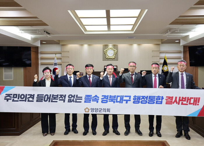 [영양=박병상 기자] 영양군의회(의장 김영범)는 5일 열린 제298회 임시회 제1차 본회의에서 ‘경북.대구 행정통합 반대 결의안’을 채택했다.
