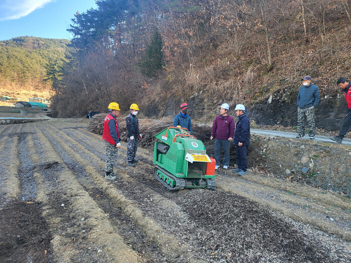 이번 파쇄작업은 농가에서 처리가 곤란하여 불법소각 할 우려가 있는 농가의 영농부산물을 사전에 조사하여 각 마을별로 방문하여 순차적으로 진행하고 있으며, 산불감시원 활용 및 전담 파쇄반을 구성하고 내년도 2월말까지 집중 파쇄 기간을 운영하여 완료할 계획이다.