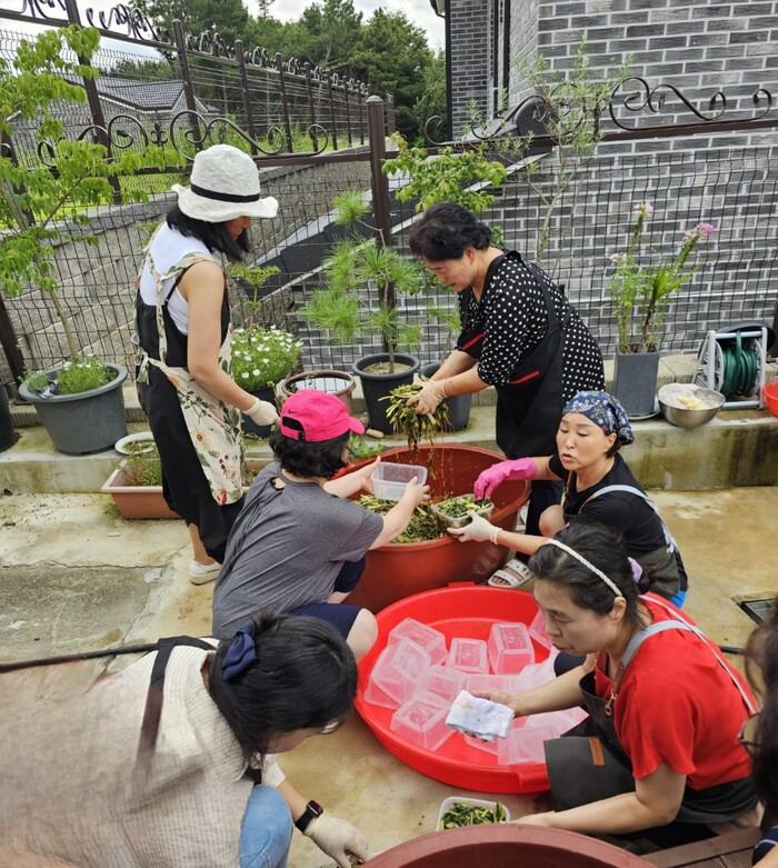 경기 여주시는 최근 여성지도자연합회 여주시지회가 '사랑의 열무김치 나눔' 행사를 진행해 취약계층 30가구에 직접 담근 열무김치를 전달했다. 사진은 연합회 회원들이 열무김치를 담가 포장을 하고 있는 모습.(사진=여주시청 제공)