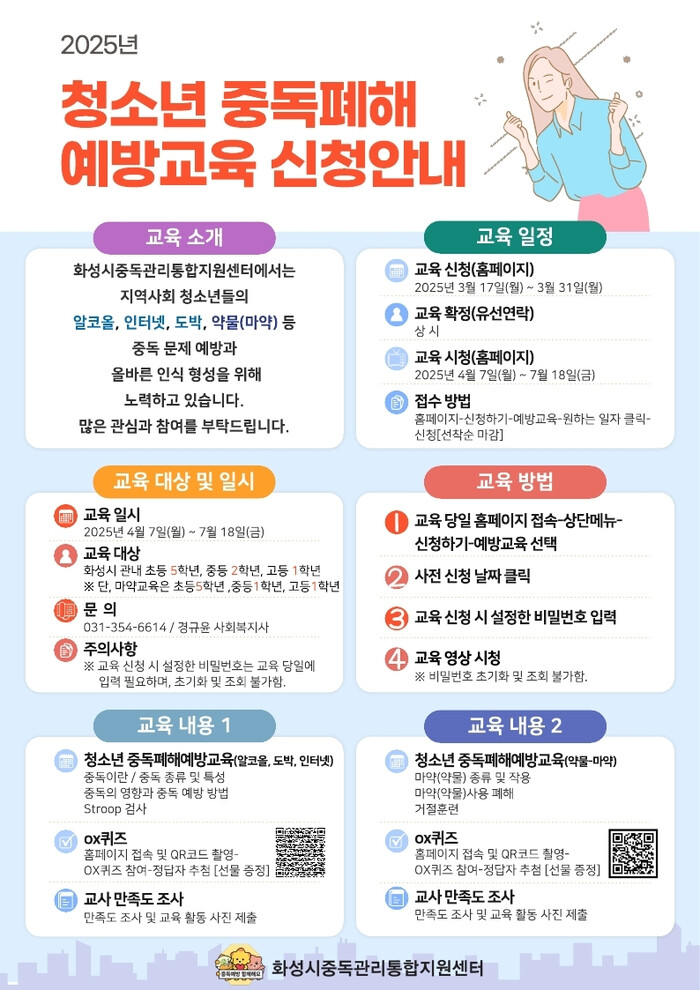 교육 수강을 희망하는 학생은 오는 31일까지 화성시중독관리통합지원센터 홈페이지에서 교육 주제를 선택해 신청하면 된다.
