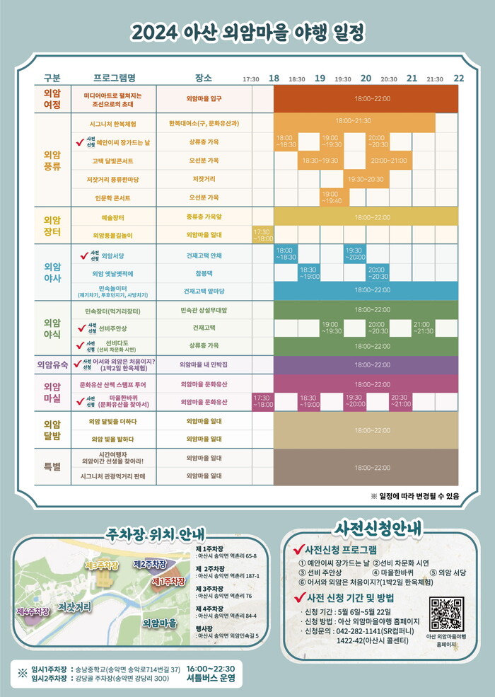자세한 내용은 아산외암마을야행 누리집, 아산시청누리집,인스타그램 등을 통해 확인할 수 있다.