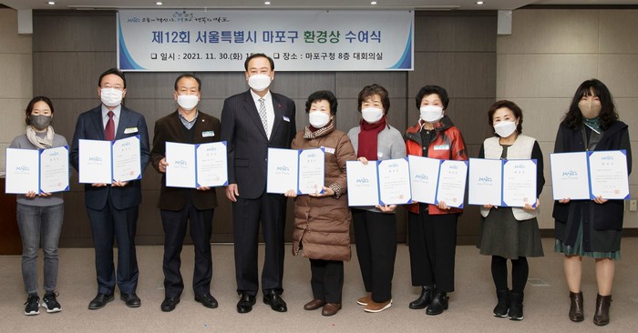 서울 마포구가 30일 ‘제12회 마포구 환경상 수여식’을 개최했다. 수여식에서는 녹색도시 마포 구현을 위해 묵묵히 헌신한 주민 및 단체 8명이 환경상 수상자로 선정돼 표창을 받았다. 사진은 유동균 구청장(왼쪽 네 번째)이 수상자들과 함께 기념촬영을 하고 있는 모습. (사진제공=마포구청)