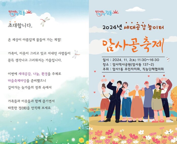 [시민일보 = 이대우 기자] 강동구(구청장 이수희) 암사1동은 주민들과 화합의 장을 마련하고자 오는 11월 2일(토) 암사역사공원(암사동 137-2)에서 개최되는 ‘2024 세대공감 놀이터 암사골 축제’에 주민들을 초대한다고 밝혔다.