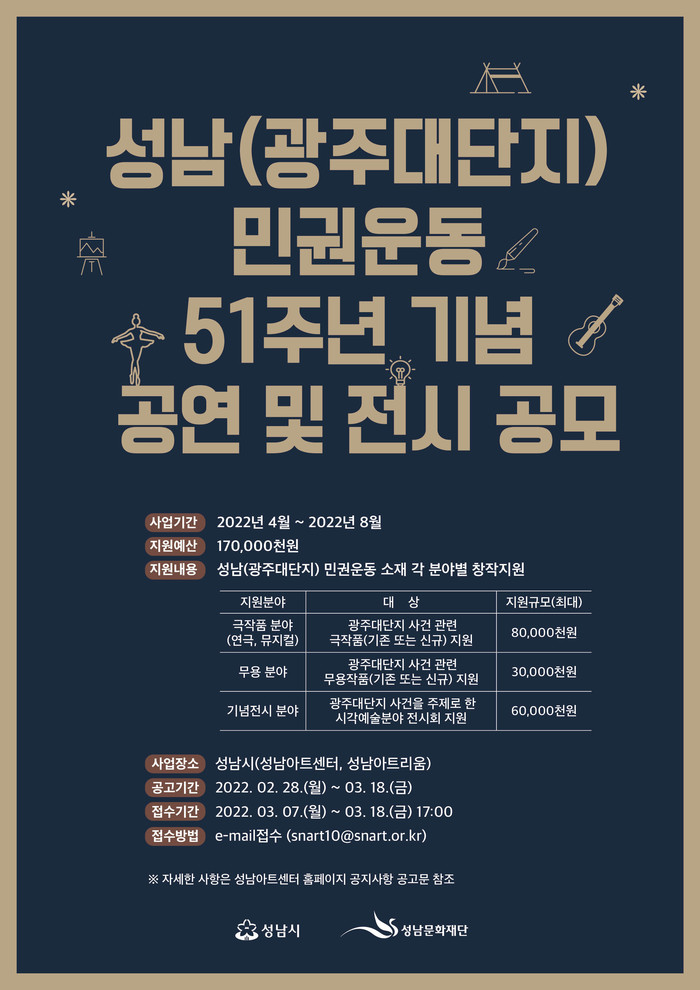 이번 ‘성남(광주대단지) 민권운동 51주년 기념 공연 및 전시 공모’는 공고일 현재 성남에 주소지를 둔 문화예술단체를 대상으로 극작품(연극, 뮤지컬)분야, 무용 분야, 기념전시 분야로 진행한다.