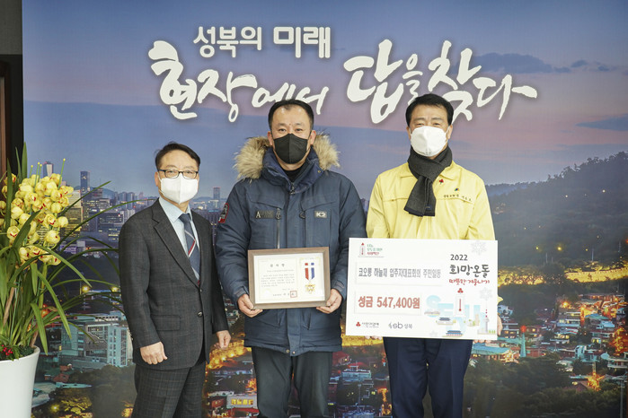 성북구는 최근 장위3동 코오롱하늘채 아파트 주민들로부터 지역내 어려운 이웃의 따뜻한 겨울나기를 위해 모금한 성금 54만7400원을 전달받았다. 사진은 전달식에서 이승로 구청장(오른쪽)과 관계자들이 기념촬영을 하는 모습. (사진제공=성북구청)