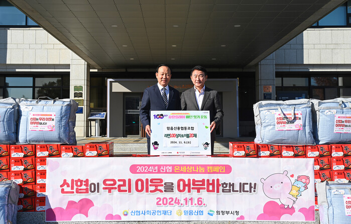 믿음신용협동조합이 6일 경기 의정부시에 라면 100상자와 이불 20채를 기탁하며 ‘100일간 사랑릴레이 배턴 잇기’에 동참했다. 믿음신용협동조합은 2018년부터 ‘온세상 나눔 운동(캠페인)’을 통해 매년 난방용품 및 생필품을 의정부 저소득층에게 지원하고 있다. 사진은 전달식에 참석한 김동근 시장(오른쪽)이 기념촬영을 하고 있는 모습. (사진=의정부시청 제공)
