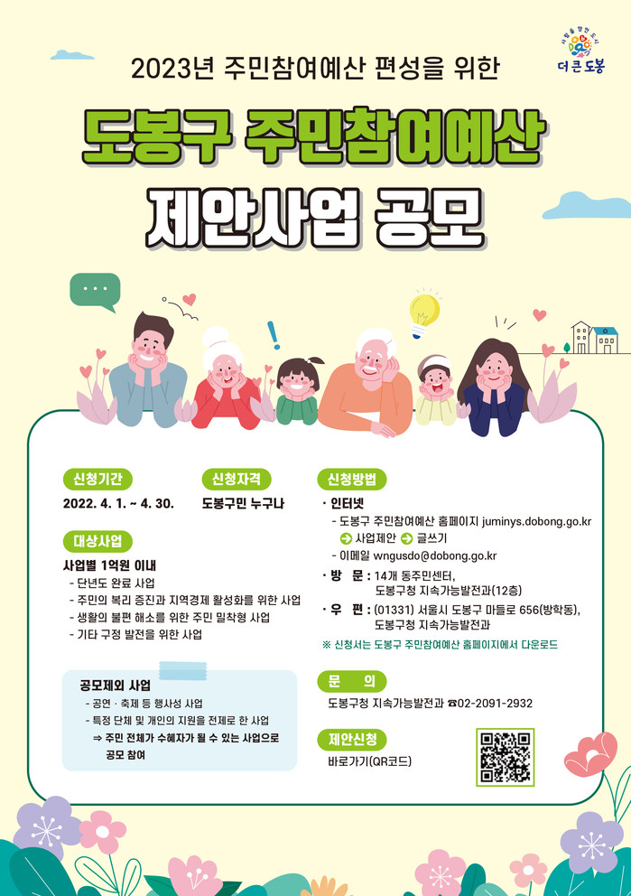 [시민일보 = 박준우 기자] 서울 도봉구(구청장 이동진)가 이달부터 ‘2023년 주민참여예산사업’ 편성을 위한 ‘주민제안사업’을 공모한다고 5일 밝혔다.