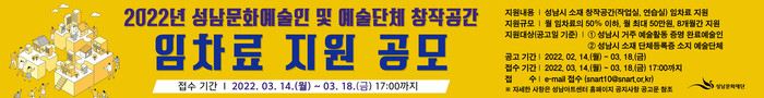 성남문화재단은 지난해에 이어 올해도 ‘문화예술인 및 단체 창작공간 임차료 지원’ 공모를 진행한다. 예술활동 증명을 완료하고 주소지가 성남인 전문 예술인이나 단체등록증을 소지하고 성남에 소재하는 문화예술단체 대표가 임차 계약한 성남시 소재 공간이면 신청할 수 있다. 공간은 작업실이나 연습실, 스튜디오 등 창작활동을 위한 공간만 가능하다.