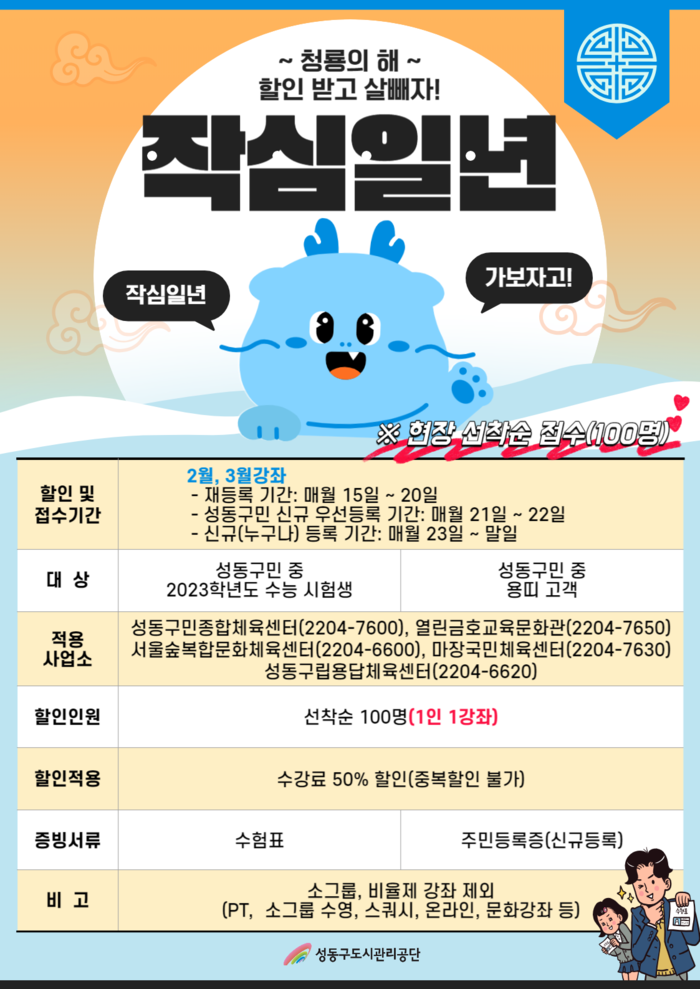 용띠 구민과 2023년에 수능 시험을 치른 구민은 올해 2~3월 성동구립체육시설에서 운영하는 강좌(일부 강좌 제외) 수강 시, 수강료의 50%를 할인받을 수 있다. 신청은 각 센터별로 현장 방문하면 된다. 1인 1강좌에 한하여 할인 적용을 받을 수 있으며, 선착순 100명에게 혜택이 돌아간다. 용띠 구민은 주민등록증(신규 등록인 경우), 수능 시험생은 수험표로 대상 여부를 확인받으면 된다.