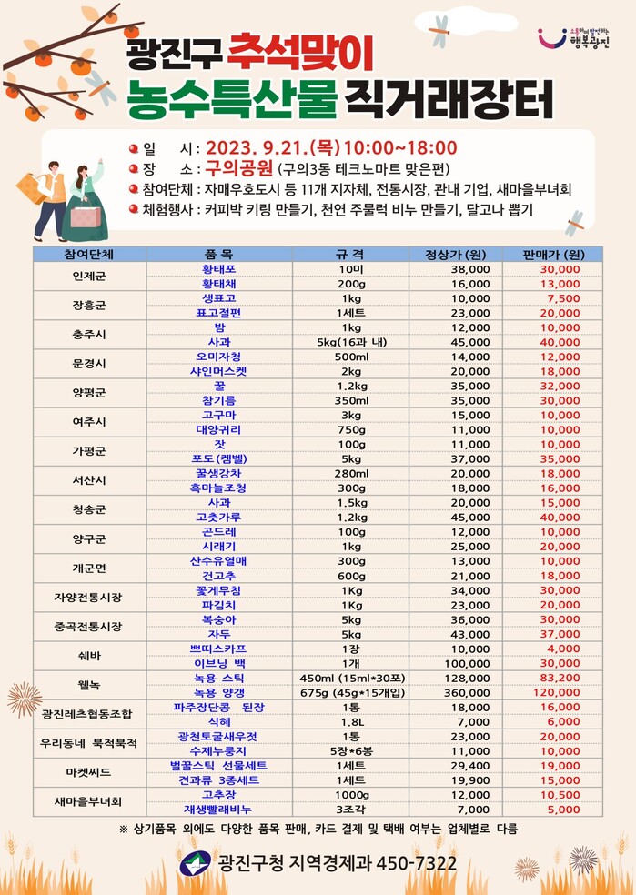 [시민일보 = 여영준 기자] 광진구(구청장 김경호)가 추석을 맞아 21일 오전 10시~오후 6시 구의공원에서 ‘추석맞이 농수특산물 직거래장터’를 개최한다.