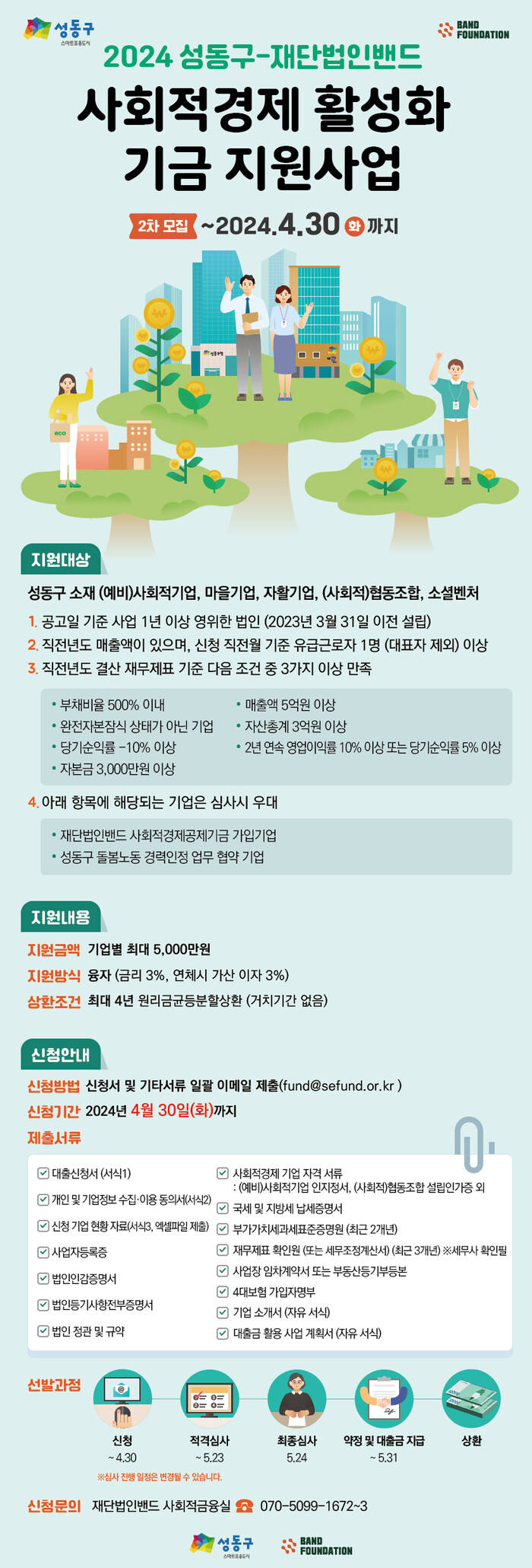 융자 신청, 상환방법 등 자세한 사항은 성동구청 누리집(새소식란) 및 재단법인 밴드 누리집에서 확인할 수 있으며, 문의사항은 성동구청 일자리정책과 또는 재단법인 밴드 사회적금융실에서 상담받을 수 있다.