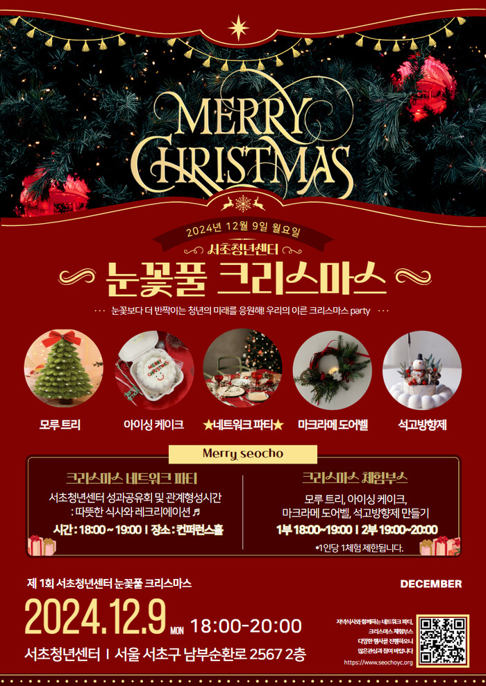 [시민일보 = 박소진 기자] 서초구(구청장 전성수)는 오는 9일 서초청년센터에서 청년들을 위한 크리스마스 파티 ‘눈꽃풀 크리스마스’를 연다.