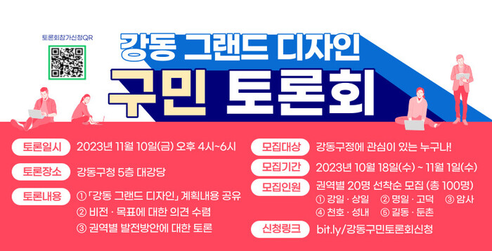 토론회 참가를 원하는 주민은 11월1일까지 신청 링크 또는 QR코드를 통해 온라인으로 신청하면 되고, 5개 권역(①강일·상일 ②명일·고덕 ③암사 ④천호·성내 ⑤ 길동·둔촌)에서 각 20명씩 총 100명을 선착순 모집한다.