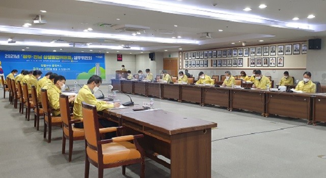 | ▲ 김종효 광주광역시 행정부시장이 21일 시청에서 열린 코로나19 비상대책회의에 참석해 백신 접종 확대 등 대책을 논의하고 있다./광주광역시 제공 |
