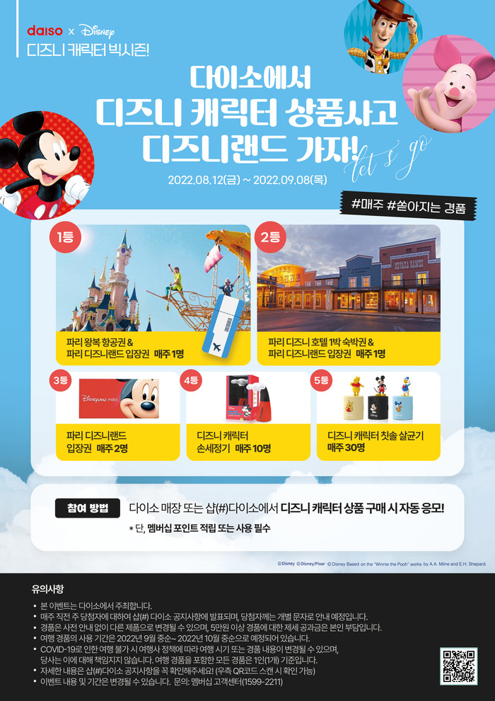 아성다이소에서 진행하는 디즈니 캐릭터 빅시즌 이벤트는 오는 9월8일까지 진행하며, 다이소 매장이나 샵(#)다이소에서 디즈니 캐릭터 상품을 구매하고 다이소 멤버십을 적립하거나 사용하면 응모가 가능하다.