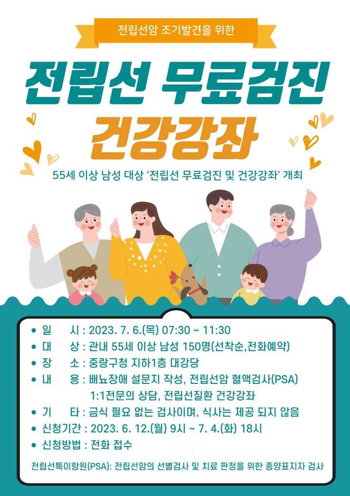 (사)한국전립선-배뇨관리협회와 함께 연계해 진행되는 검진은 오는 7월 6일 목요일 오전 7시 30분부터 11시 30분까지 중랑구청 지하대강당에서 실시된다.
