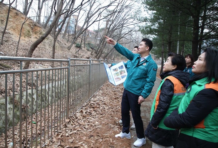오언석 서울 도봉구청장은 최근 해빙기를 맞아 지역내 안전사고 발생 위험이 높은 안전취약시설, 산사태 우려 지역 등을 찾았다. 이날 오 구청장은 도봉2 재개발구역 아파트 공사 현장과 산지방재사업 대상 지역을 찾아 안전관리계획 수립 및 시행 여부, 공사장 주변 지반 침하 등을 확인했다. 사진은 오 구청장(가운데)이 산사태 예방 공사 진행 상황 등을 확인하고 있는 모습. (사진=도봉구청 제공)