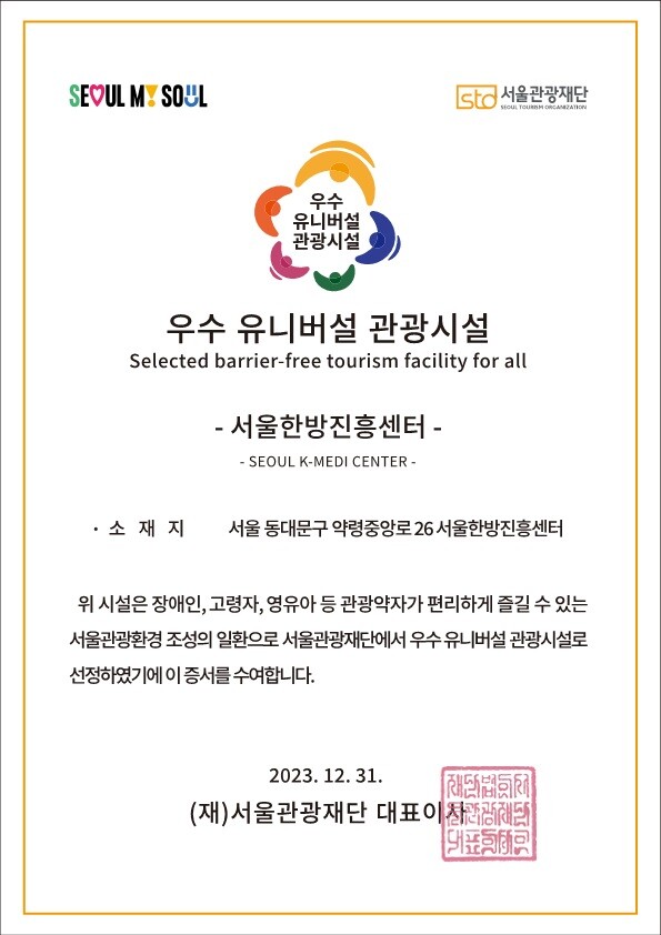 평가는 서류와 현장 방문으로 이뤄졌다. 서울한방진흥센터는 ▲시설 접근성 용이 ▲장애인 화장실·주차장 운영 ▲엘리베이터 운영 ▲영유아 편의시설 운영 ▲청결한 위생상태 ▲수어 콘텐츠 제공 등 다방면에서 관광 약자가 이용하기 우수한 시설로 인정받아 최종 선정될 수 있었다.