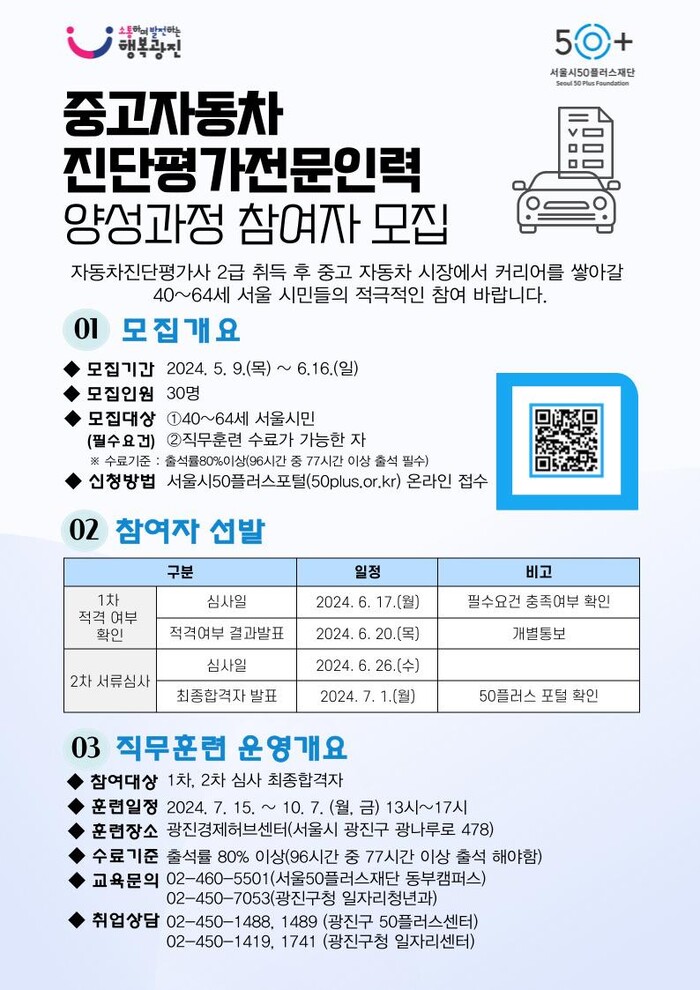 [시민일보 = 여영준 기자] 광진구(구청장 김경호)는 서울시50+재단 동부캠퍼스와 함께 40~64세 중장년층 취업역량 강화를 위해 오는 7월15일~10월7일 ‘중고자동차 진단평가 전문인력 양성과정’을 운영한다고 밝혔다.