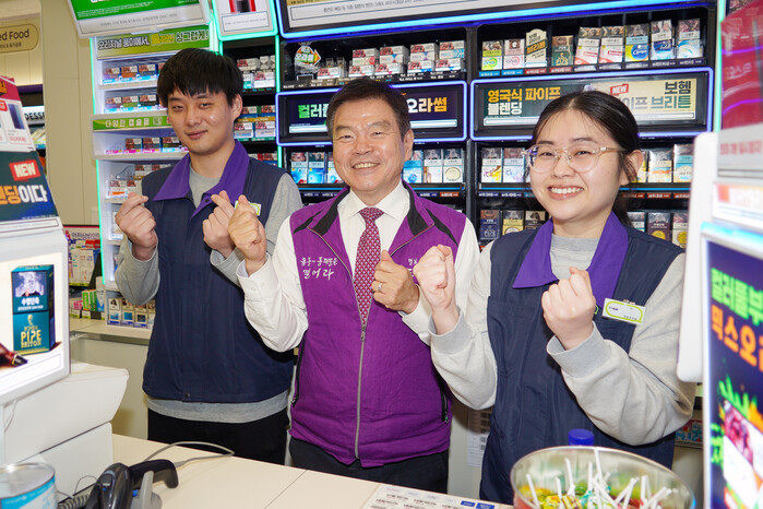 | ▲ 이필형 구청장(가운데)이 ‘CU 전농우리점’에서 근무하고 있는 자활근로자들을 격려하고 있다. (사진=동대문구청 제공) |