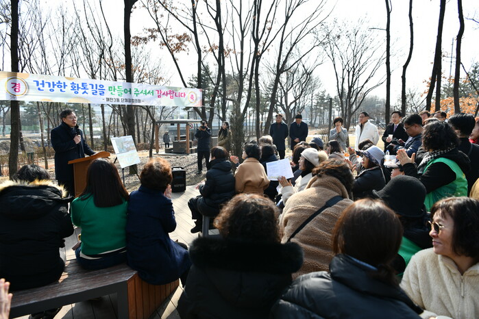 경기 수원시 영통구가 최근 매탄3·4동에 위치한 매탄·머내생태공원에서 ‘황톳길 조성사업 준공식’을 개최했다. 그간 매탄동 주민들은 자연 속에서 맨발로 걸을 수 있는 황톳길 조성을 제안해왔으며, 구는 이를 반영해 세밀하게 검토 후 리모델링을 추진하게 됐다. 사진은 준공식에 참석한 박사승 구청장이 인사말을 하고 있는 모습. (사진=영통구청 제공)