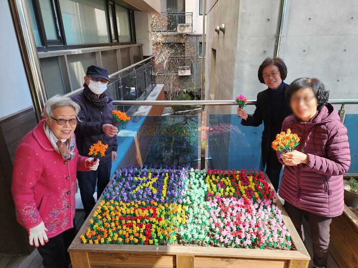 | ▲ ‘반갑다방’에서 활동하는 어르신들이 종이꽃을 만들어 심은 ‘한뼘 미술관’ 모습. (사진=은평구청 제공) |