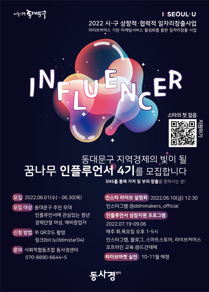 구 관계자는 “이번 프로그램에 참여한 주민들이 스스로 콘텐츠를 제작해 경쟁력을 강화하고 동대문구 상업 인프라와 결합해 시너지를 낼 수 있길 바란다”며, “앞으로도 인플루언서 양성과 경쟁력 강화를 통해 온라인 e-커머스를 활성화하고 동대문구를 청년이 오고 싶은 도시로 조성해나가겠다”고 밝혔다.