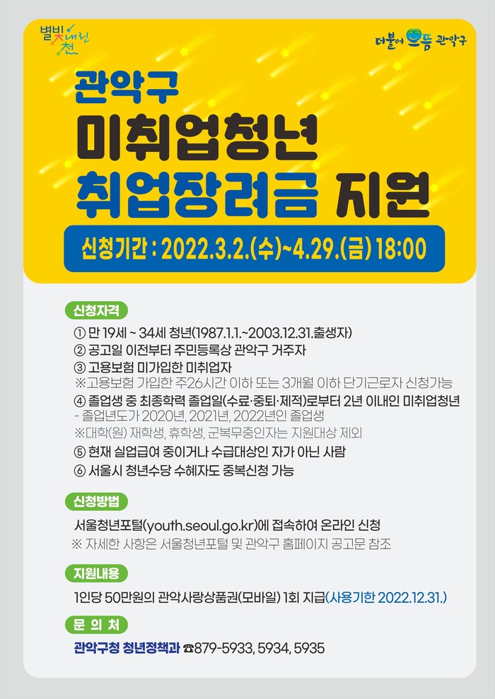 [시민일보 = 박준우 기자] 서울 관악구(구청장 박준희)가 2일부터 코로나19로 어려움을 겪는 미취업청년들을 위한 취업장려금 신청을 시작했다.
