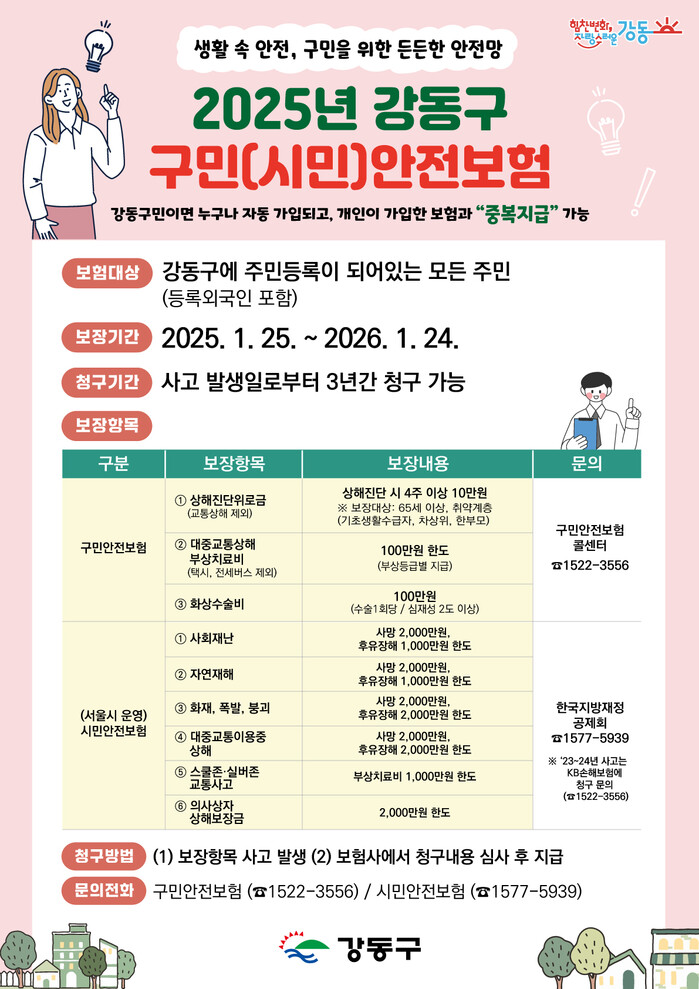 [시민일보 = 이대우 기자] 강동구(구청장 이수희)가 올해 더 많은 구민들이 혜택을 받을 수 있도록 구민안전보험 보장항목을 대폭 확대했다고 5일 밝혔다.