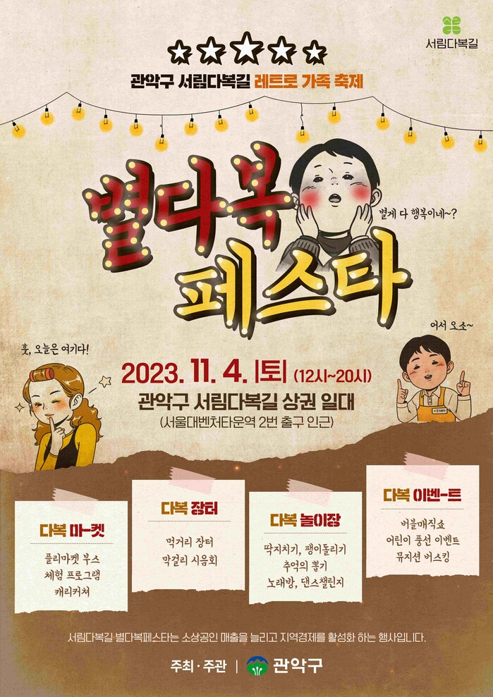 구는 11월 4일 낮 12시부터 오후 8시까지 관악구 서림동 신림로18가길 일대(서림다복길, 서울대벤처타운역 2번출구 인근)에서 ‘서림다복길 별다복페스타’를 개최한다.