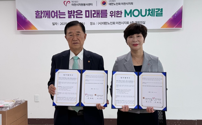 [시민일보 = 민장홍 기자] 경기 이천시자원봉사센터가 이천 지역 노인들과 자원봉사자들이 함께 더욱 행복하고 건강한 공동체를 조성하고자, 대한노인회 이천시지회와 업무협약(MOU)을 체결했다.