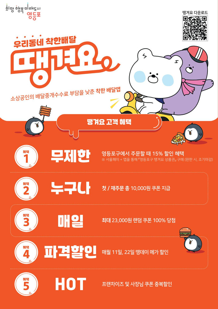 ‘땡겨요’는 가맹점에게 낮은 중개 수수료를 제공하는 모바일 배달앱이다. 소상공인의 경영 부담 완화와 지역경제 활성화를 위해 올해 새롭게 시행하는 주요 정책 중 하나이다.