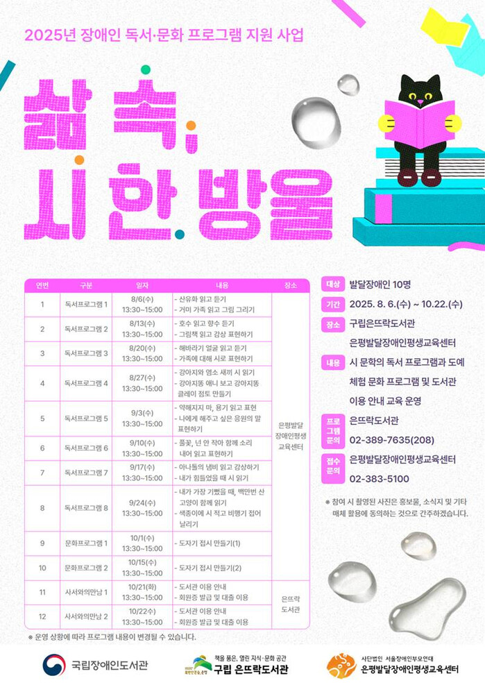 [시민일보 = 이대우 기자] 서울 은평구(구청장 김미경)는 국립장애인도서관 주최의 ‘2025년 장애인 독서·문화 프로그램 지원사업’에 구립 은뜨락도서관이 선정돼 발달장애인 대상 ‘삶 속, 시 한 방울’ 프로그램을 운영한다고 밝혔다.
