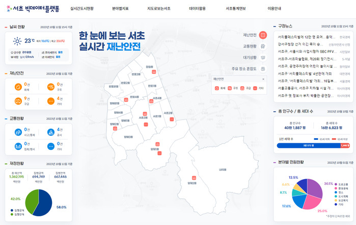 16일 구에 따르면 ‘서초 빅데이터플랫폼’은 구의 부서별로 산재된 공공데이터 11개 카테고리, 480여종을 통합해 실시간 확인 가능한 시스템으로, 구민들이 다양한 행정 정보를 시각화해 보기 쉽게 제공하고, 부서 구분 없이 행정 데이터를 활용한다.